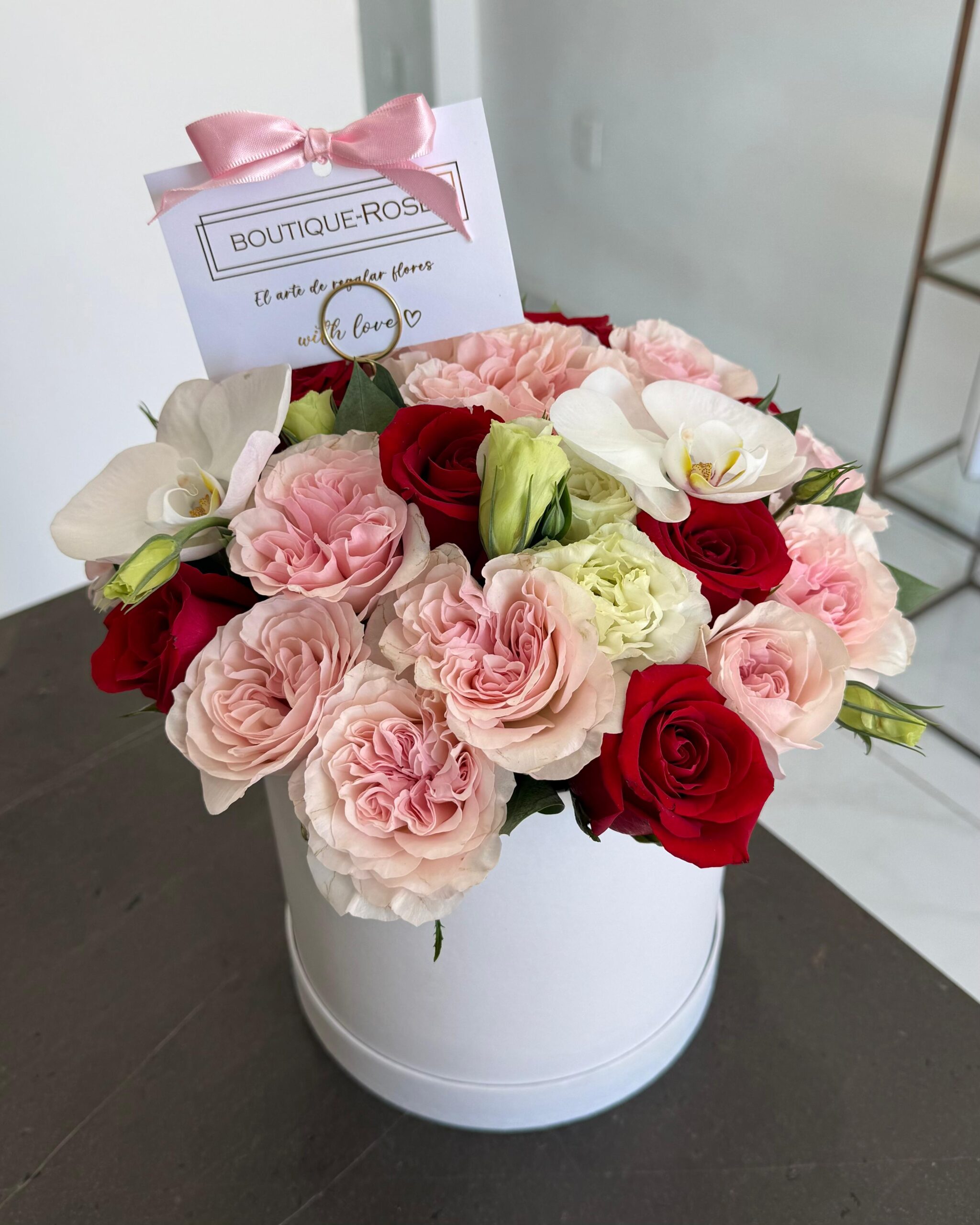 Hermoso arreglo floral en caja con rosas, lisianthus y dos flores de orquídeas.